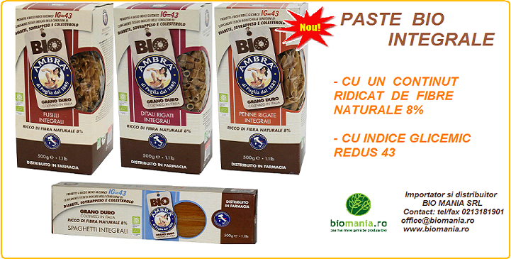 Incepand cu aceasta vara, in exclusivitate pentru Romania, Biomania aduce pastele integrale Bio Ambra cu indice glicemic (IG) scazut. Indicele glicemic este, pe o scara de 0 la 100, o clasificare a carbohidratilor in functie de capacitatea lor de crestere a nivelului zaharurilor in sange, imediat dupa ce acestia au fost consumati. Alimentele cu un indice glicemic ridicat sunt rapid procesate si absorbite si produc fluctuatii (cresteri) importante al nivelului zaharului in sange. Cele cu IG redus, datorita digerarii si absorbtiei lente, produc cresteri graduale ale glicemiei si insulinei si s-a demonstrat astfel ca aduc beneficii pentru sanatate.