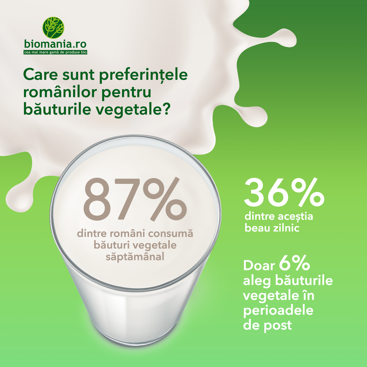 Tendința către o viață sănătoasă este în creștere la nivelul României și este determinată fie de dorința de a înlocui laptele cu băuturi vegetale BIO (49%), fie din dorința de a savura gustul unei băuturi pe bază de cereale sau fructe precum migdalele sau cocos. 36% dintre respondenți consumă zilnic băuturi vegetale și 21% o data la două zile. Doar 8% afirmă că alegerea lor e motivată de un regim alimentar restrictiv (cum ar fi diabetul).