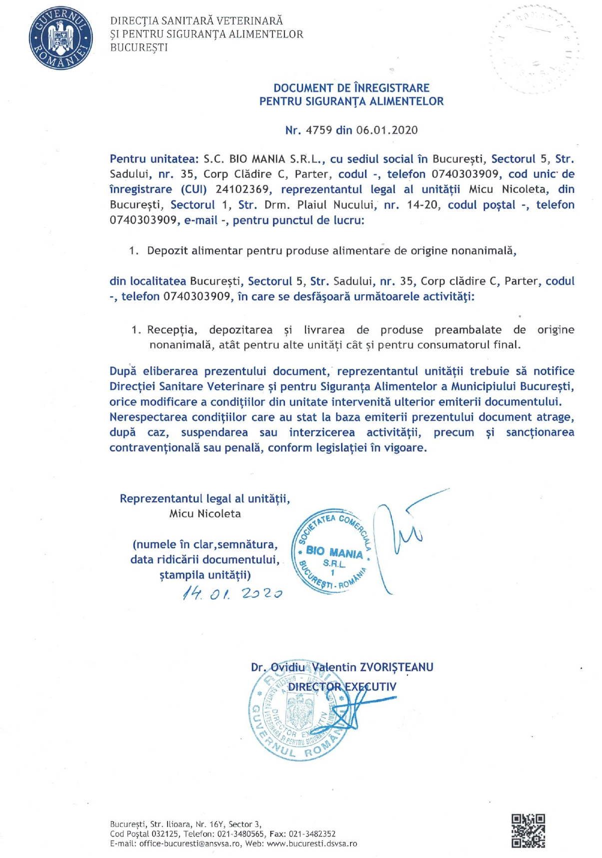 1. Depozitul Biomania.ro respecta toate normele legale pentru comercializarea si depozitarea produselor. Activitatea este avizata de catre Directia Sanitar Veterinara si Pentru Siguranta Alimentara, conform Documentului de inregistrare cu numarul 4759 din 06.01.2020.