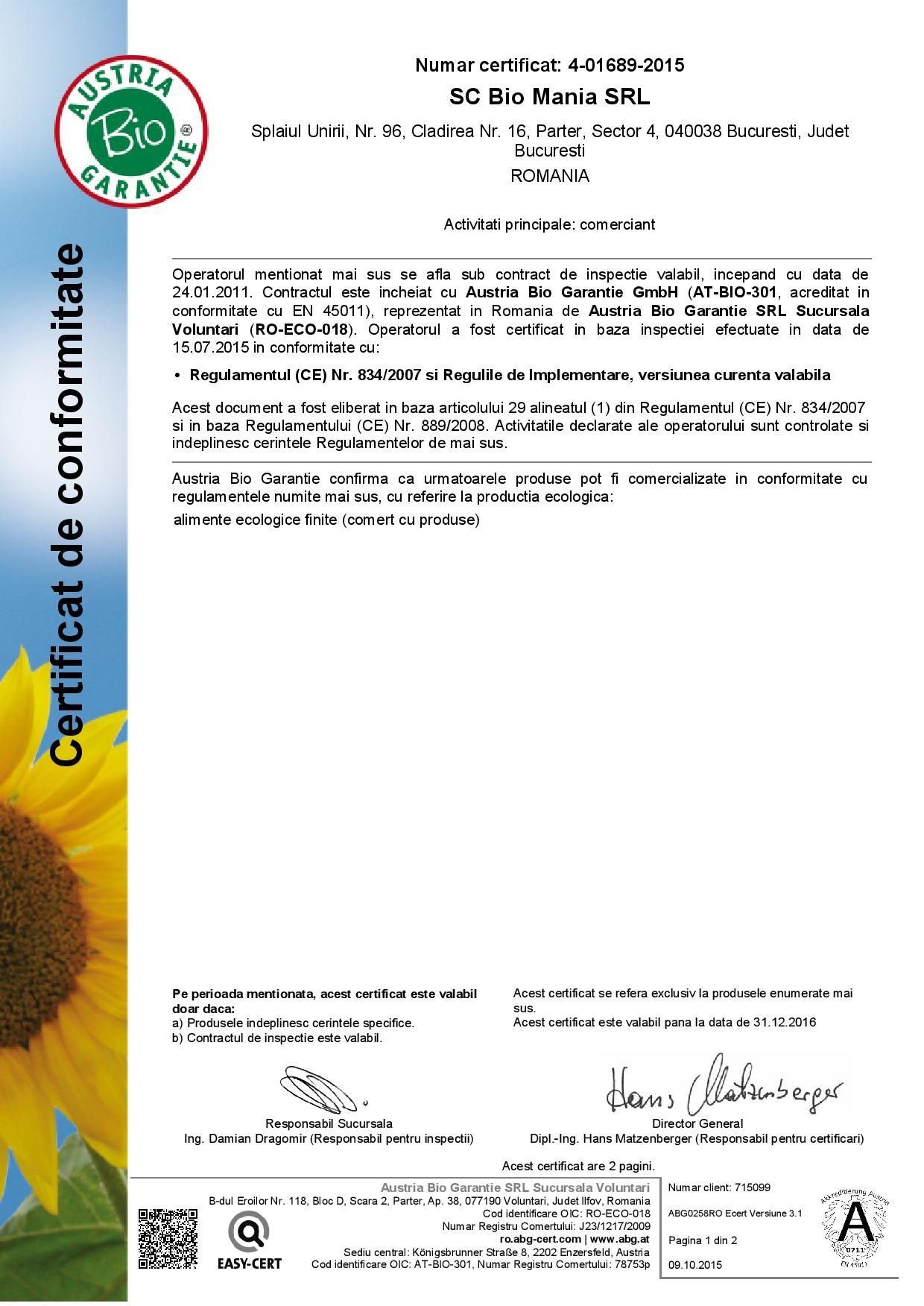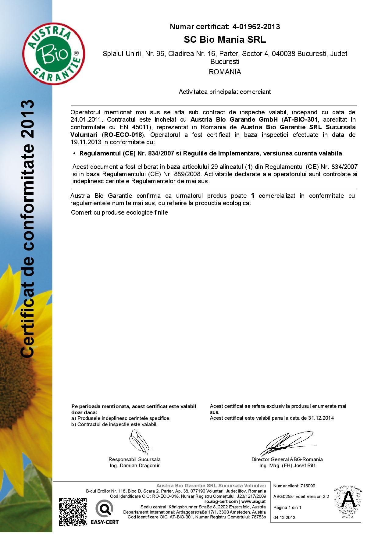 Inca de la lansare din 2008, SC BIO MANIA SRL ce detine magazinul online www.biomania.ro a obtinut certificarea de comerciant de produse ecologice. Din respect pentru consumatorul de bio, dar si pentru a inchide lantul certificarilor produselor bio, am trecut anual prin rabojul dur al conditiilor impuse de organismele de certificare in domeniu, in cazul nostru AUSTRIA BIO GARANTIE, avand codul RO-ECO-018.