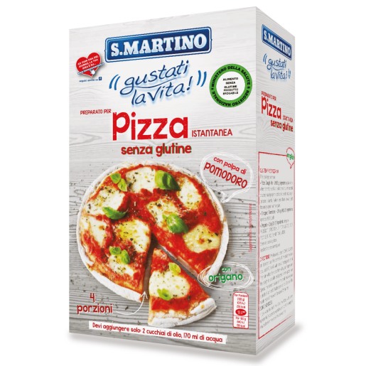 | Ingrediente | 1Plic amestec de baza pentru pizza - (249,5 g): amidon de grâu deglutinat, făină de orez, amidon de cartofi, lapte praf degresat, agenți de creștere: difosfat, carbonat acid de sodiu; amidon, fibra de semințe de psyllium, sare, agent de îngroșare: gumă de xantan. 1 cutie cu Roșii tocate - 210g (45,6%): roșii (99,8%), sare - origine rosii ITALIA 1 plic de Oregano - 0,5g (0,1%): oregano. |
