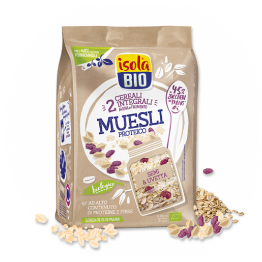 Muesli proteic cu semințe și stafide Isola Bio nou, un clasic al micului dejun în pur stil Isola Bio, adică... certificat biologic și integral.