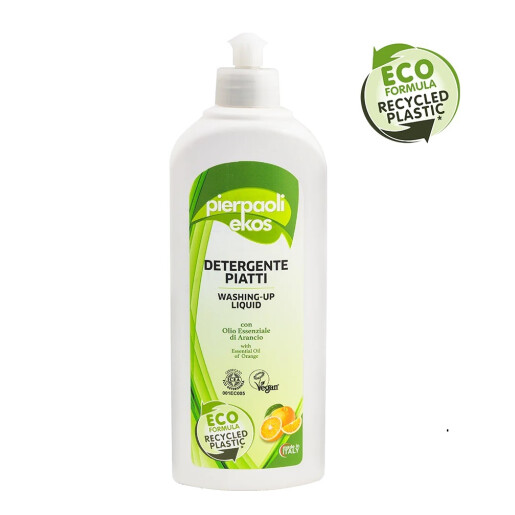 Detergent lichid ecologic Pierpaoli Ekos cu ulei esential de portocale pentru spalarea manuala a vaselor.